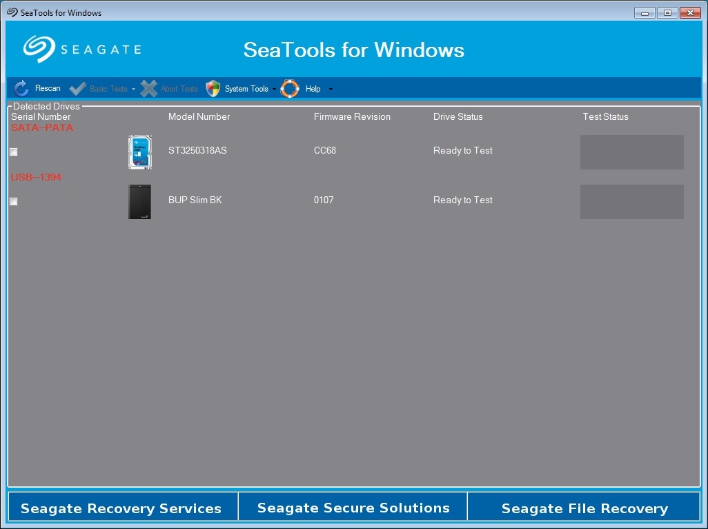 La herramienta está hecha por Seagate, pero puede probar las unidades, independientemente del fabricante. La interfaz es sencilla y fácil de usar. Una vez que se puso en marcha, detecta automáticamente todas las unidades instaladas y su información, incluyendo el número de modelo. La prueba de un coche es tan fácil como seleccionar y luego la elección de las herramientas de la base Pruebas de menú.