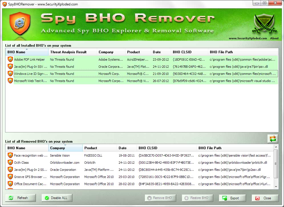 Un objeto de ayuda del navegador o BHO es un plugin o un complemento creado para mejorar la capacidad de € ™ s Microsoftâ Internet Explorer. BHO son útiles pero a menudo son mal utilizados por los programas de software espía para vigilar las actividades del usuario y recopilar información personal. Por otra parte, algunos BHO podrían afectar sustancialmente el rendimiento de su sistema. Esta utilidad está especialmente diseñado para ayudarle a eliminar los objetos de ayuda del navegador maliciosos. La herramienta tiene una interfaz sencilla e intuitiva por lo que es fácil de usar.